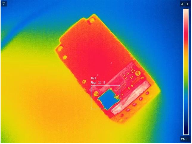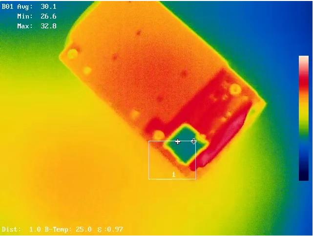 常見的電路板故障一般為短路、斷路或者接觸不良。短路時電路板電流較正常情況下大,因此對應元件有溫升,其紅外熱像圖較正常情況下有明顯異常;斷路或者接觸不良時,通過元件的電流值幾乎為零,此時,對應元件的溫度較正常工作時低,也能夠明顯的顯示在熱像圖中。因此,可根據(jù)以上原理非常方便的判斷出電路板的故障點
