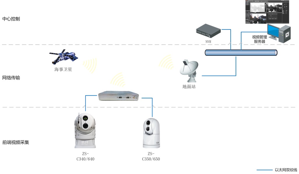 系統由前端雙波段攝像機,網絡傳輸和后端監控室組成。