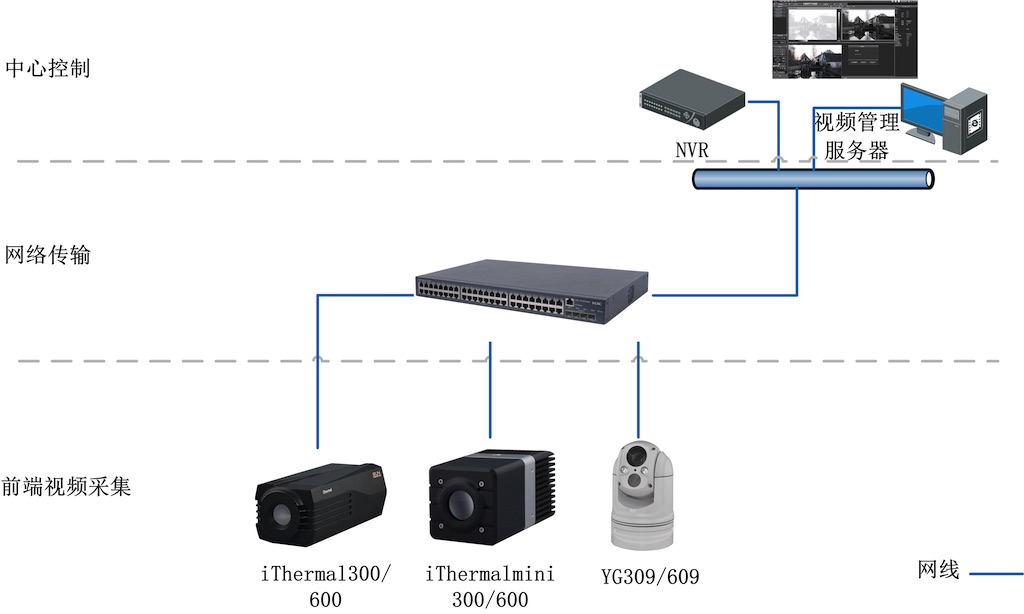 系統由前端雙波段攝像機,網絡傳輸和后端監控室組成。